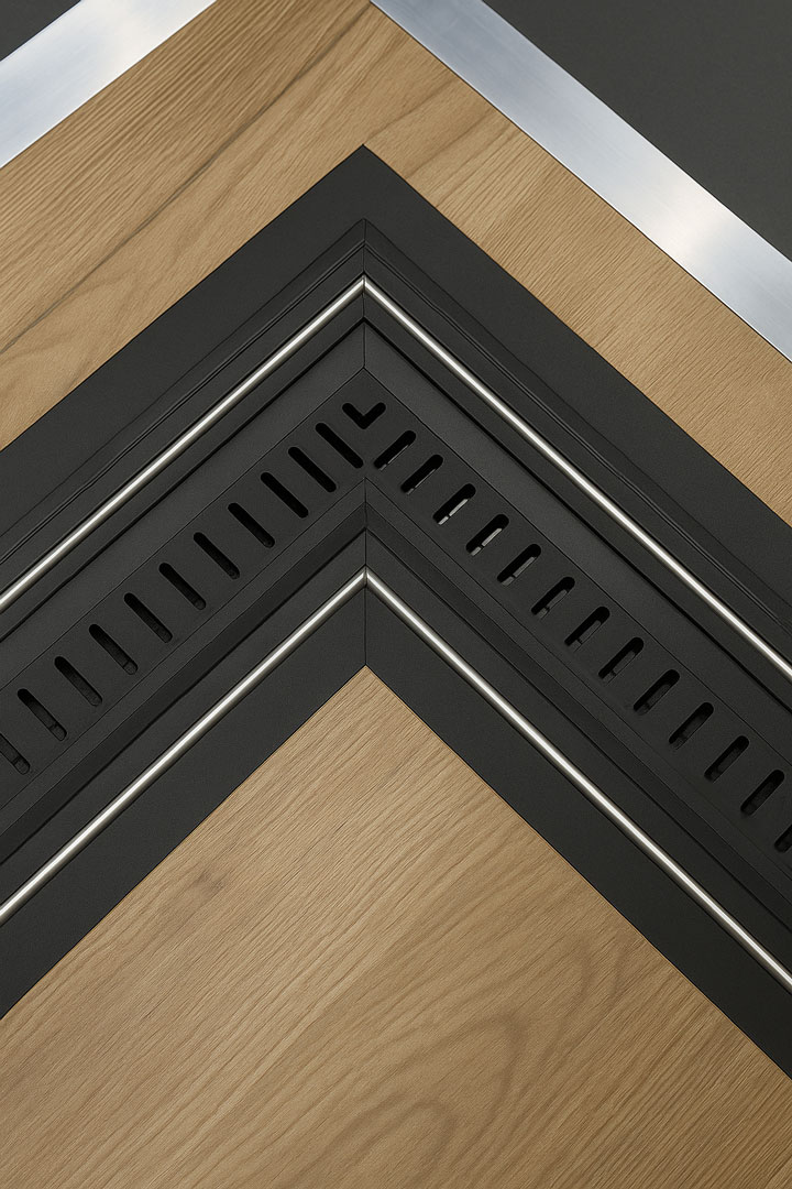 Su diseño cuida tanto la funcionalidad como la estética. Ofrece una solución de esquina libre, eliminando el perfil central para lograr una apertura total, y un marco completamente embutido en el suelo y la pared, que permite un paso sin obstáculos y una integración perfecta con el pavimento.